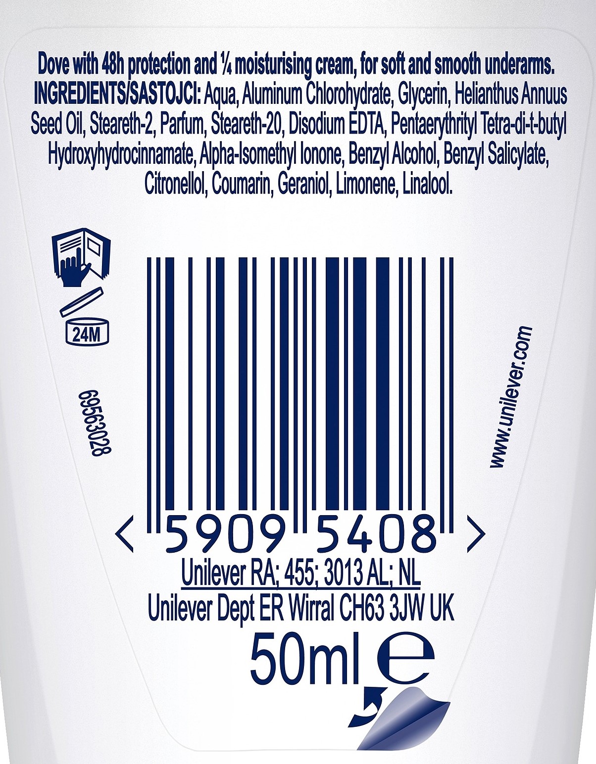 Dove Powder Deo roll-on antiperspirantti suojaa tehokkaasti hikoilulta ja pahoilta hajuilta jopa 48 tunnin ajan. Alkoholittoman antiperspirantin koostumuksessa on mukana kosteusvoidetta, jonka ansiosta kainalot tuntuvat pehmeiltä ja sileiltä. Samalla antiperspirantti auttaa hoitamaan kainaloiden ihoa. Deodorantissa on miellyttävä ja rauhoittava puuterin tuoksu.
