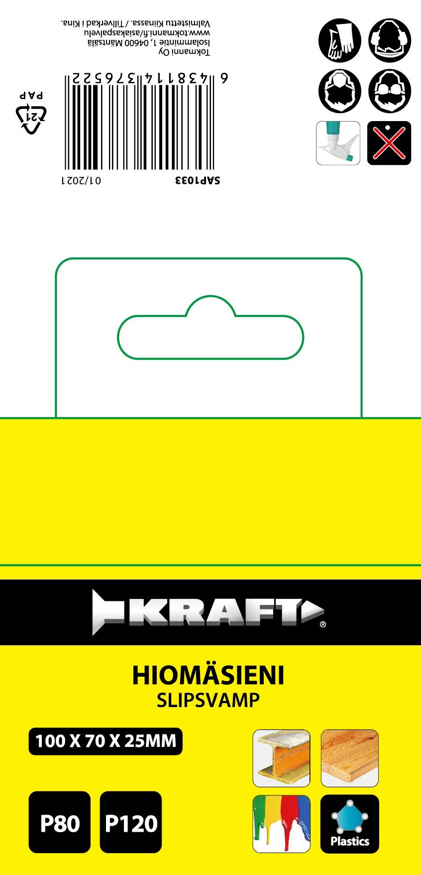 Kraft-hiomasieni maalille, puulle, muoville ja metallille. Koko 100 x 70 x 25 mm. Karkeudet P80, P120.