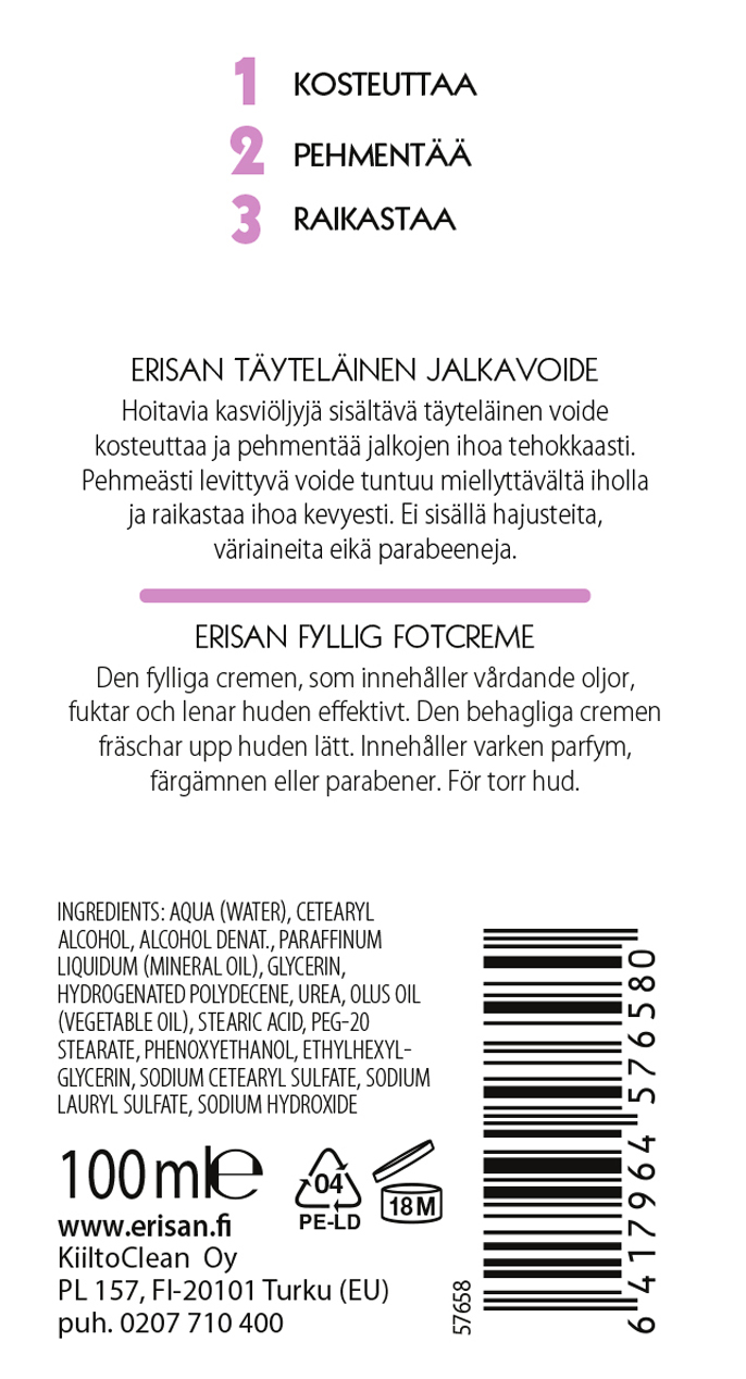 Erisan hajusteeton ja täyteläinen jalkavoide auttaa kosteuttamaan jalkojen ihoa pitkävaikutteisesti sekä hellästi. Hajusteeton.