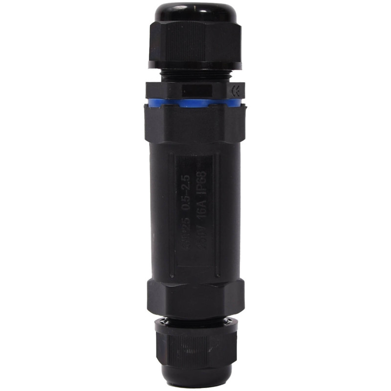 Jatkoliitin 5-napainen ruuviliitäntä. 0.5 - 2.5 mm² johtimille, kaapelin ulkohalkaisija ∅ 6 - 11 mm. Max. Nimellisjännite: 250 V AC. Max. Nimellisvirta: 16 A. Käyttölämpötila: -40°C...+105°C. Suojaluokka: IP68. Materiaali: Polyamidi Pa66.
