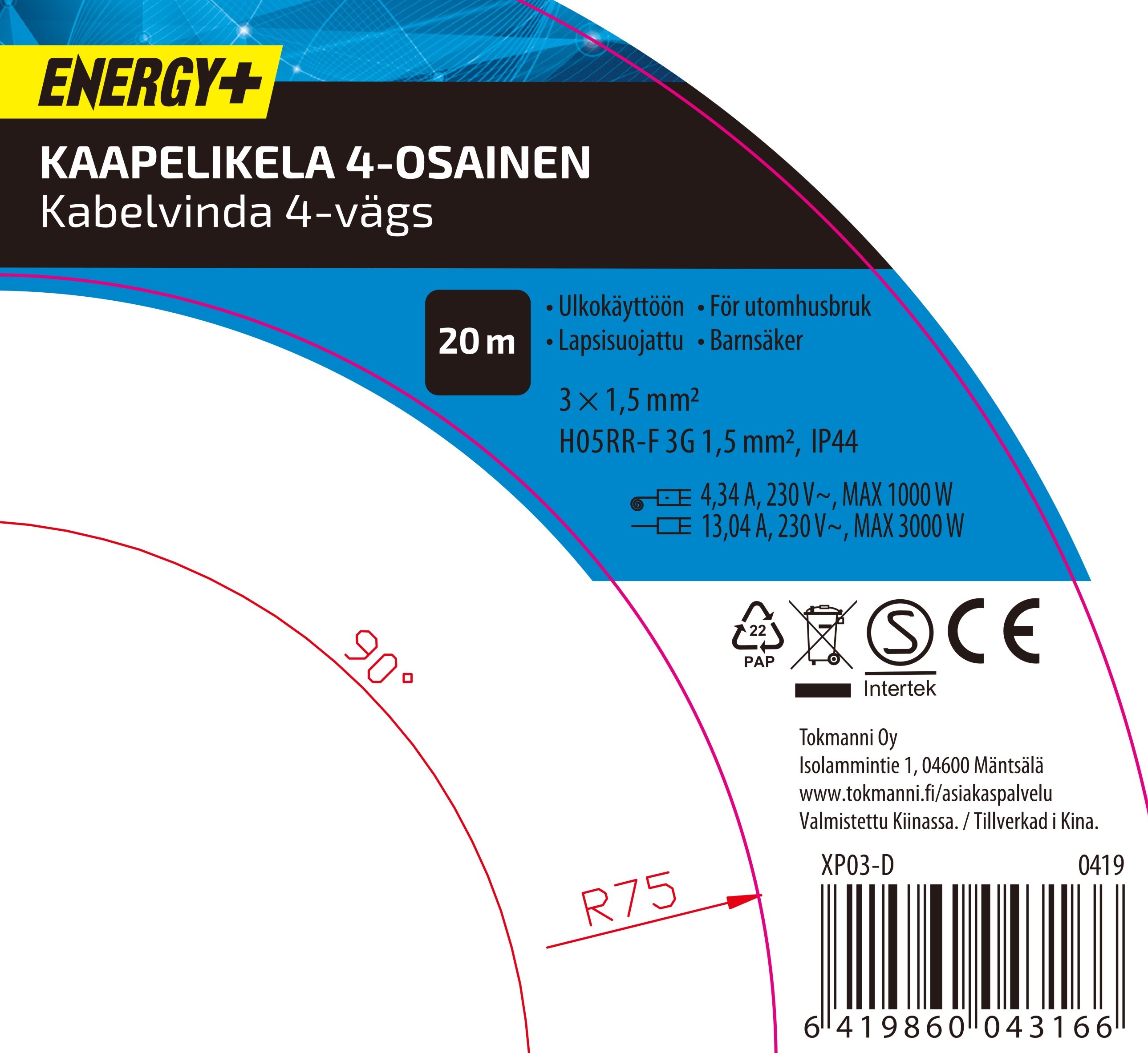 Kumipäällysteisellä, myös ulkokäyttöön sopivalla 20-metrisellä kaapelilla vedät sähköt esim. lisärakennukseen mökillä tai työkaluja varten rakennus- tai remonttikohteissa. Huomioi kelan maksimikuormitus: johto ulosvedettynä 3000 W (13,04 A), johto kelattuna 1000 W (4,34 A). Ylikuumenemissuoja ja kätevä kantokahva.