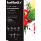 Kotikulta-kattila päivittäiseen ruoanlaittoon. Ruostumattomasta teräksestä valmistetussa kattilassa on kolmikerrospohja, höyryaukollinen lasikansi sekä bakeliittikahvat ja -nuppi. Kattilan sisäpuolella on mittataulukko ruoanlaittoa helpottamaan.