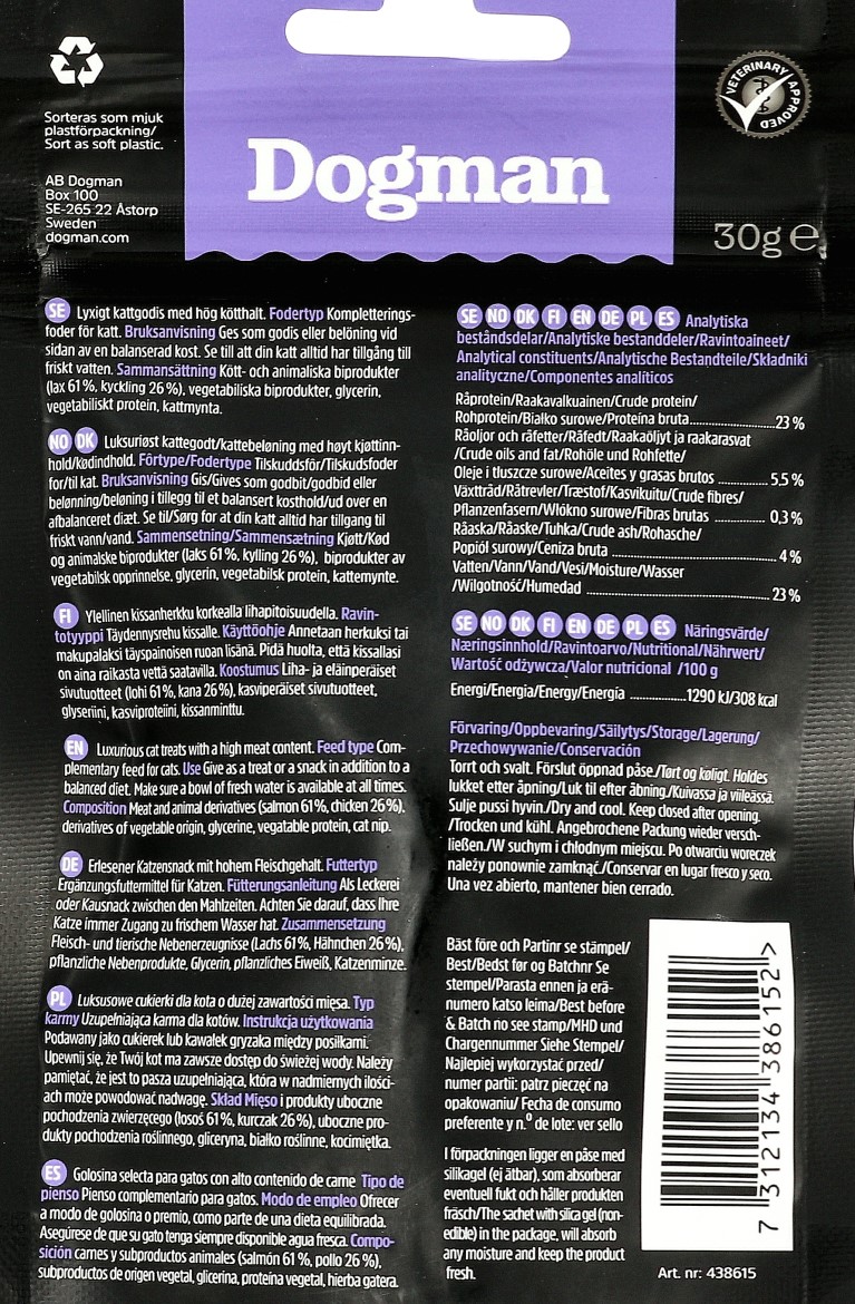 Dogman MeatyFish on maistuva kissanherkku lohesta ja herkullisesta kanasta. Herkku sisältää myös kissojen rakastamaa kissanminttua.