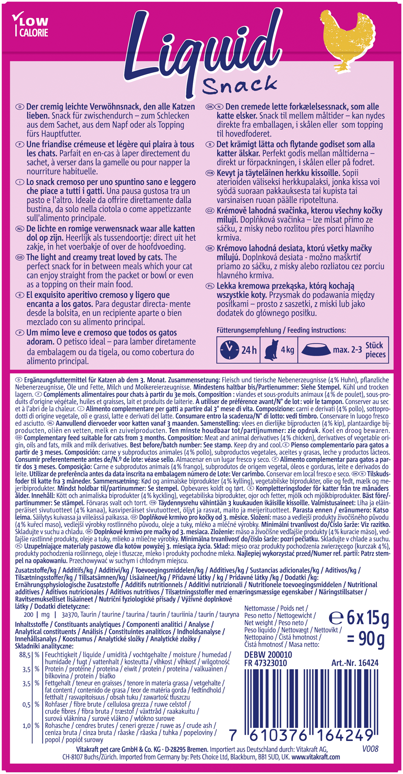 Vitakraft Cat Liquid snack -nestemäinen kissanherkku. Tämän kananmakuisen herkkupalan voi tarjota kissalle maustekastikkeena pääruoan kanssa, tai antaa sellaisenaan.