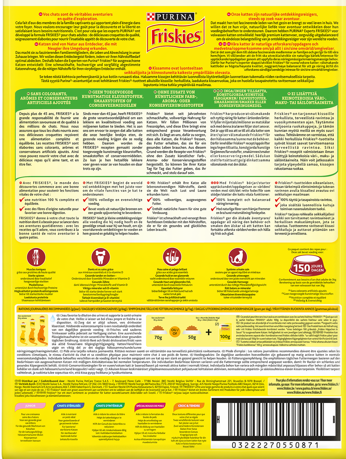 Friskies Adult nauta, kana & kasvis -täysravinto auttaa lemmikkiäsi pysymään parhaassa kunnossa ja elinvoimaisena. Maittava ravinto on valmistettu valikoiduista laadukkaista raaka-aineista. Sisältää korkealuokkaista proteiinia, rasvahappoja, vitamiineja ja mineraaleja, jotka tukevat kissasi terveyttä, elinvoimaa ja onnellisuutta.