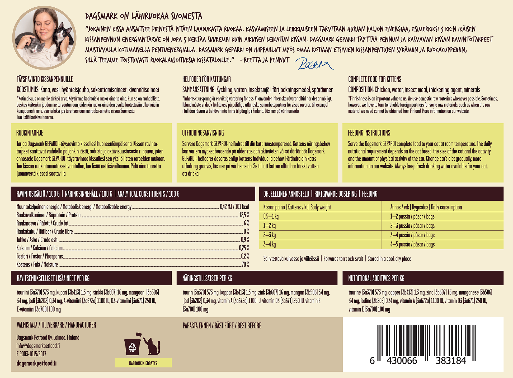Dagsmark Gepardi on suomalaista maistuvaa kanaa ja hyönteisiä sisältävä patee. Kotimainen, maukas ja proteiinipitoinen kissanpennun täysravinto sisältää kaikki kissasi tarvitsemat kivennäisaineet sekä vitamiinit.