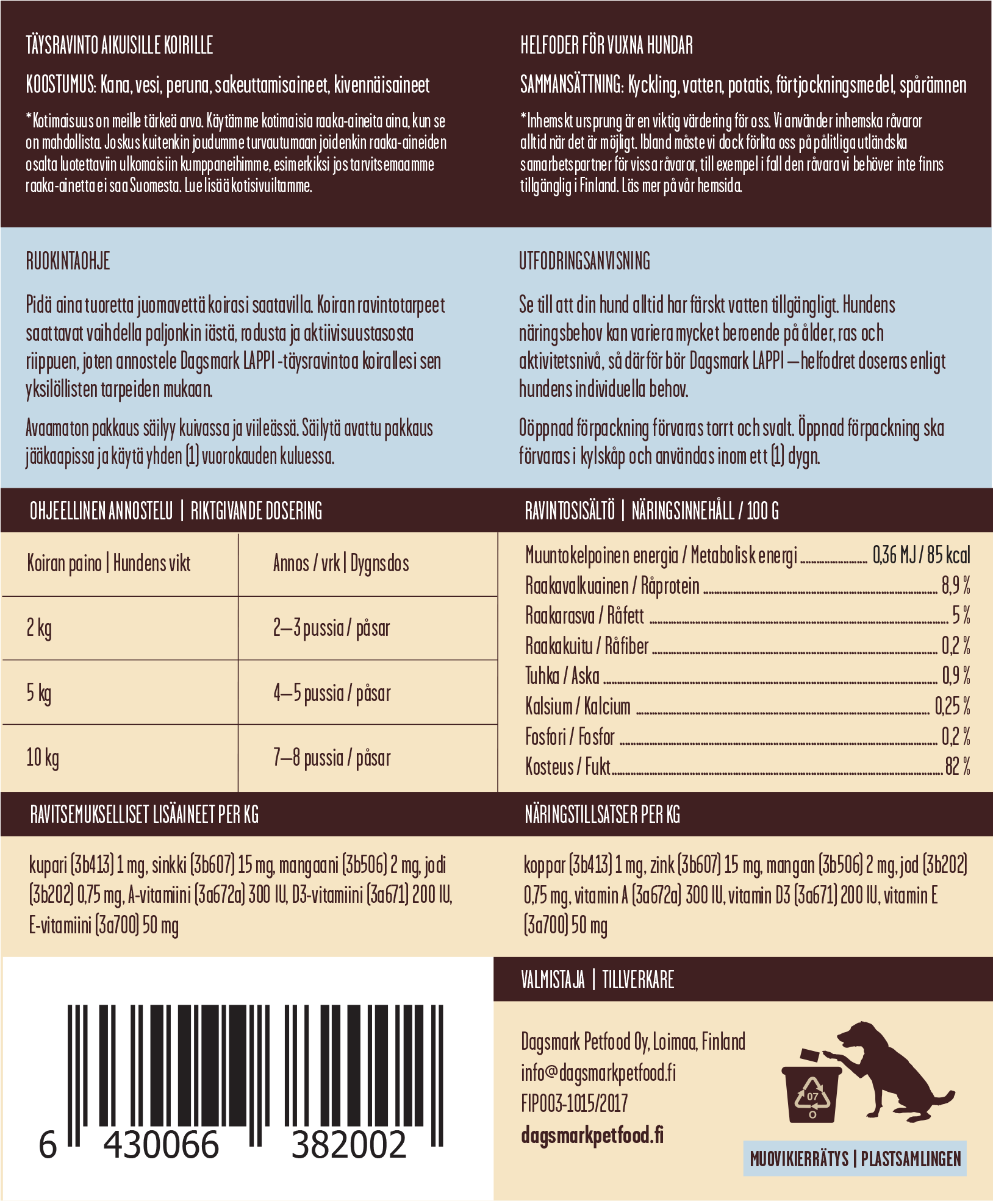 Dagsmark Lappi on kotimainen aikuisen koiran märkä täysravinto, joka tukee koiran hyvinvointia. Ruoan maukas ja proteiinipitoinen koostumus sisältää suomalaista maistuvaa kanaa ja perunaa kastikkeessa. Kana on kasvatettu ilman antibioottia. Ei sisällä viljaa, soijaa, lisättyä sokeria, säilöntä- tai väriaineita.
