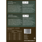 Vehnätön. Proteiinia 30 %, rasvaa 20 %.