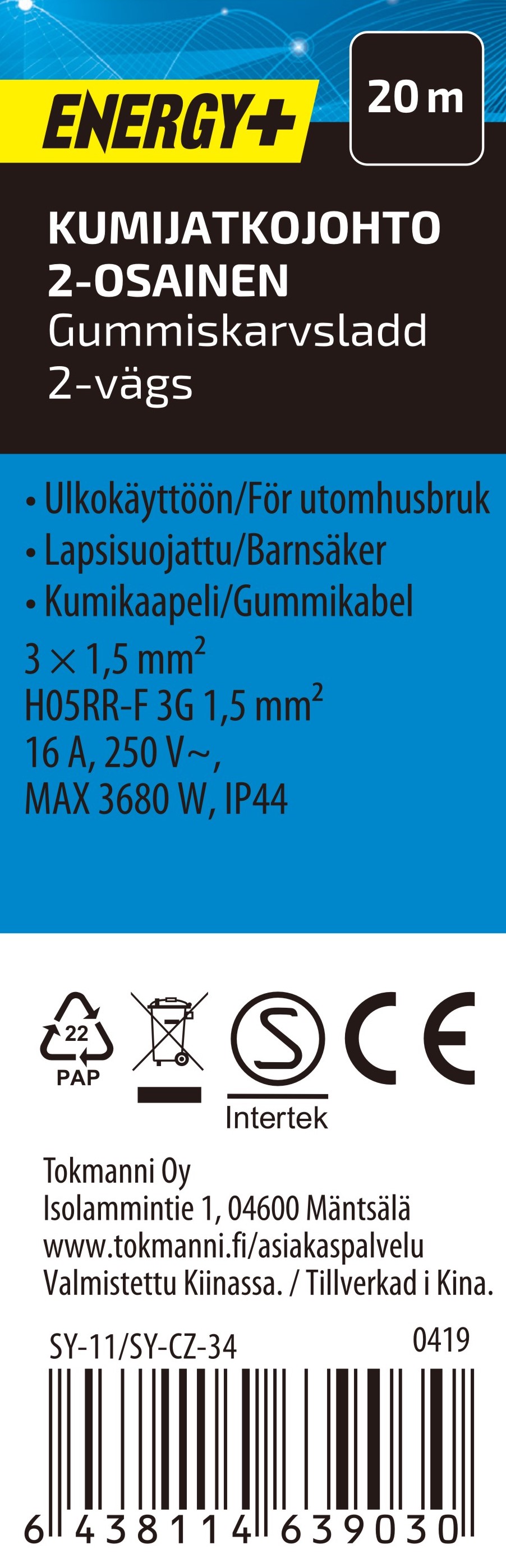 Kumipäällysteisellä 20-metrisellä kaapelilla vedät sähköt esim. kesämökin lisärakennukseen tai puutarhan sähkölaitteille ym. sähkötyökaluille. Kaksi maadoitettua pistorasiaa (huomioi johdon maksimikuormitus: 3680 W).