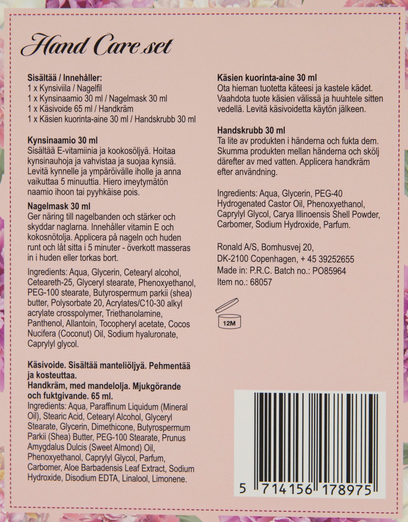 Pioninkukilla kuvioitu kädet & kynnet -lahjapakkaus on ihastuttava ja käytännöllinen lahjaidea. Käsien ja kynsien hemmottelusetti sisältää pehmentävän ja kosteuttavan käsivoiteen (65 ml), käsien kuorinta-aineen (30 ml), hoitavan ja vahvistavan kynsinaamion (30 ml) sekä kynsiviilan.