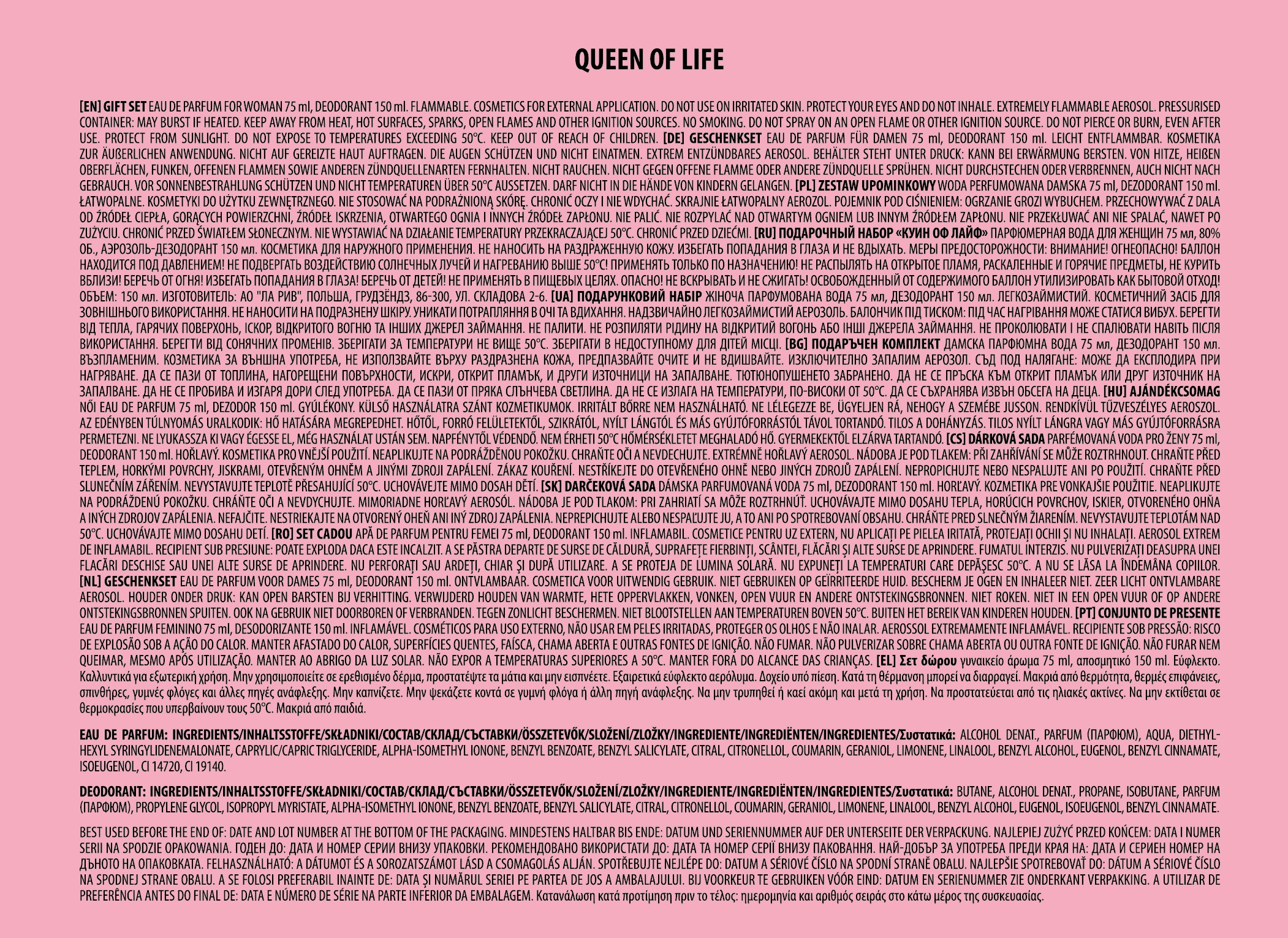 La Rive Queen Of Life -lahjapakkaus on täynnä ihastuttavaa tuoksua. La Rive Queen Of Life -tuoksun alkutuoksussa tuoksuvat mustaherukka ja päärynä, sydäntuoksussa iiris, appelsiininkukka ja jasmiini sekä pohjatuoksussa manteli, tonkapapu, praliini, patsuli ja vanilja. Lahjapakkaus sisältää La Rive Queen Of Life EdP -naisten tuoksun (75 ml) ja La Rive Queen Of Life -deodorantin (150 ml).