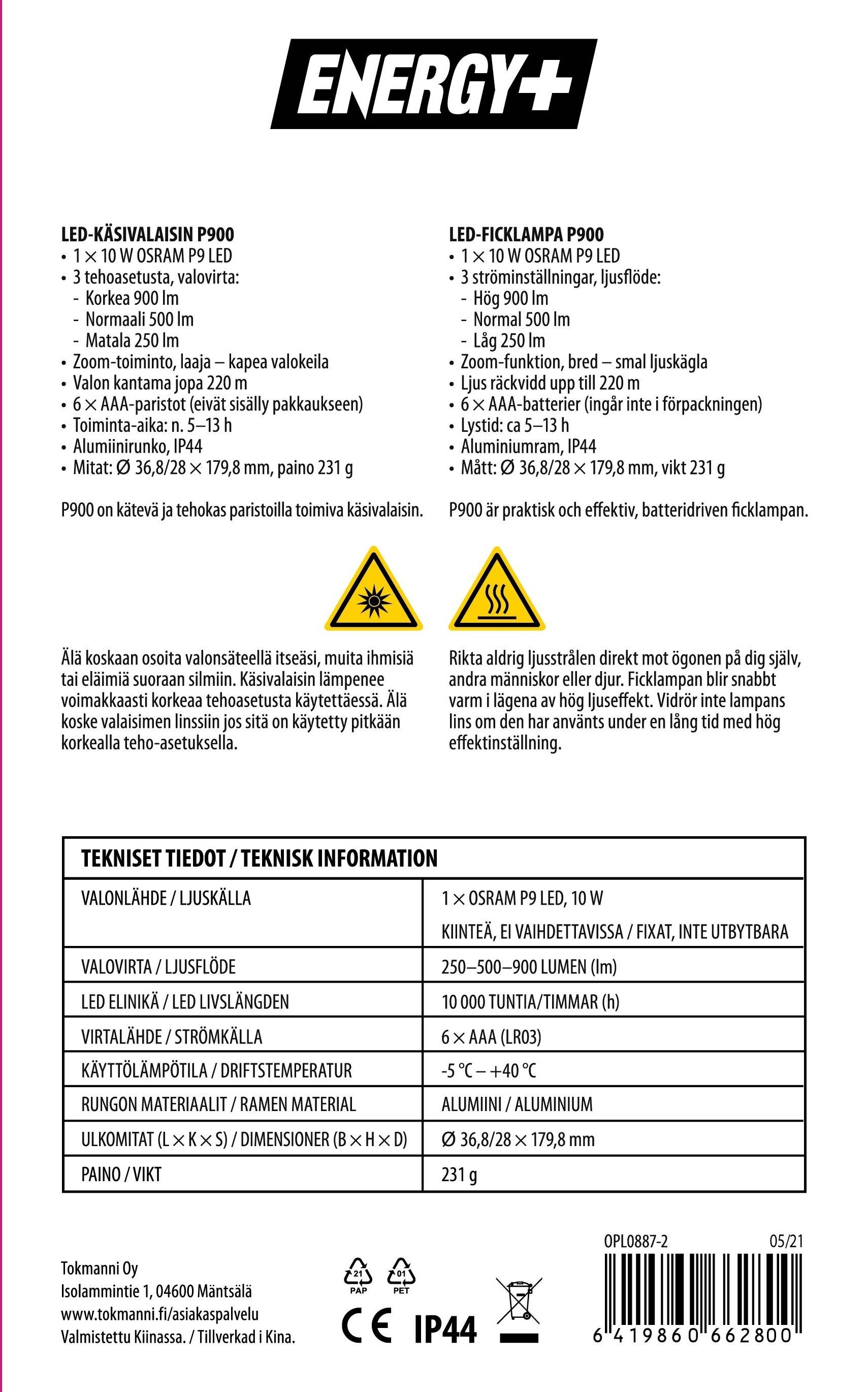 Tehokas ja kätevä Energy+ P900 käsivalaisin on varustettu Osram P9 LEDillä, joka tuottaa jopa 900 lm valovirran. Valaisimessa on myös 3 tehoasetusta (250–900 lm), zoom-toiminto sekä alumiinirunko IP44-kotelointiluokituksella. Toimii kuudella AAA-paristolla. Mitat ⌀36,8/28 × 179,8 mm.