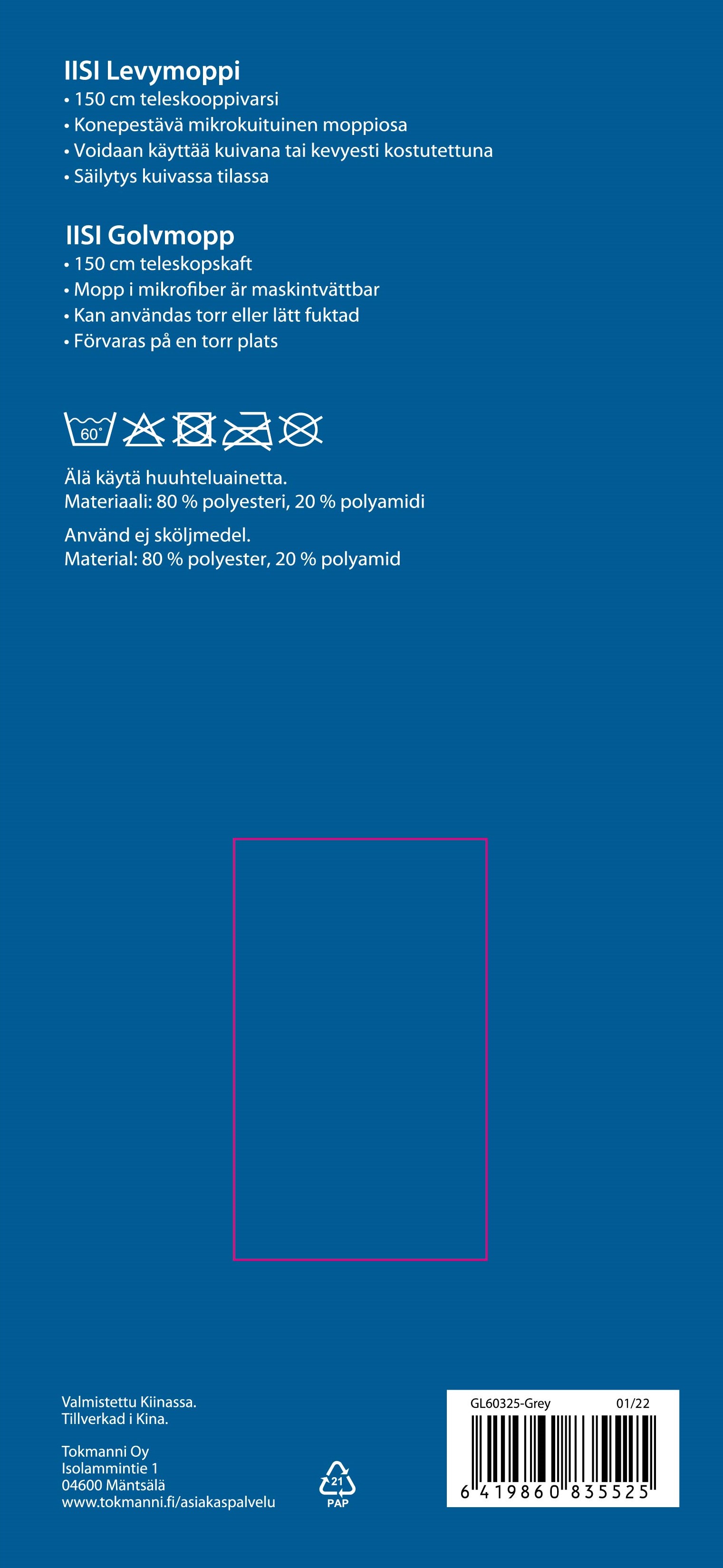 Iisi-levymopissa on irrotettava ja vaihdettava mikrokuituinen moppiliina sekä teleskooppivarsi, jonka maksimipituus on 150 cm. Moppiliinaa voidaan käyttää sekä kuivana että kevyesti kostutettuna. Säilytä kuivassa tilassa.