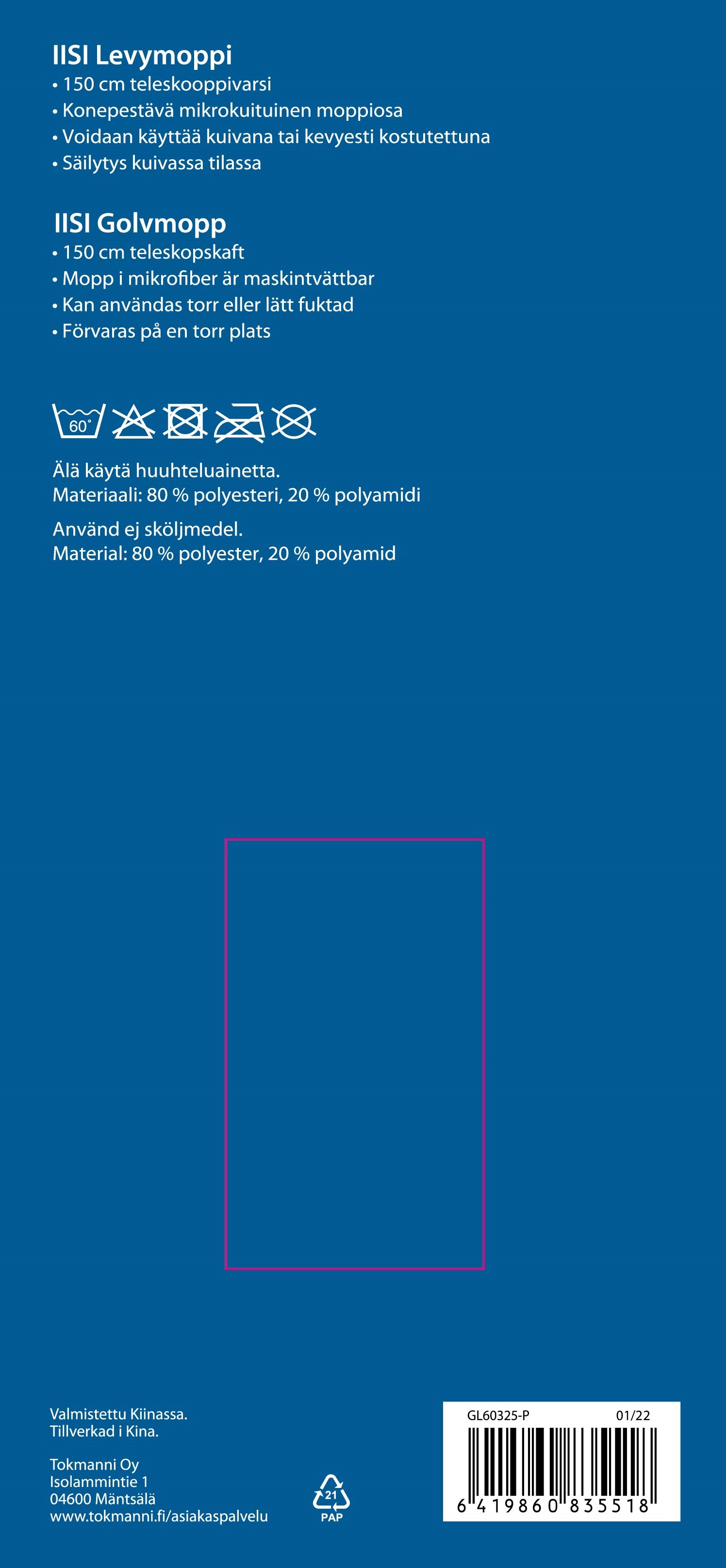 Iisi-levymopissa on irrotettava ja vaihdettava mikrokuituinen moppiliina sekä teleskooppivarsi, jonka maksimipituus on 150 cm. Moppiliinaa voidaan käyttää sekä kuivana että kevyesti kostutettuna. Säilytä kuivassa tilassa.