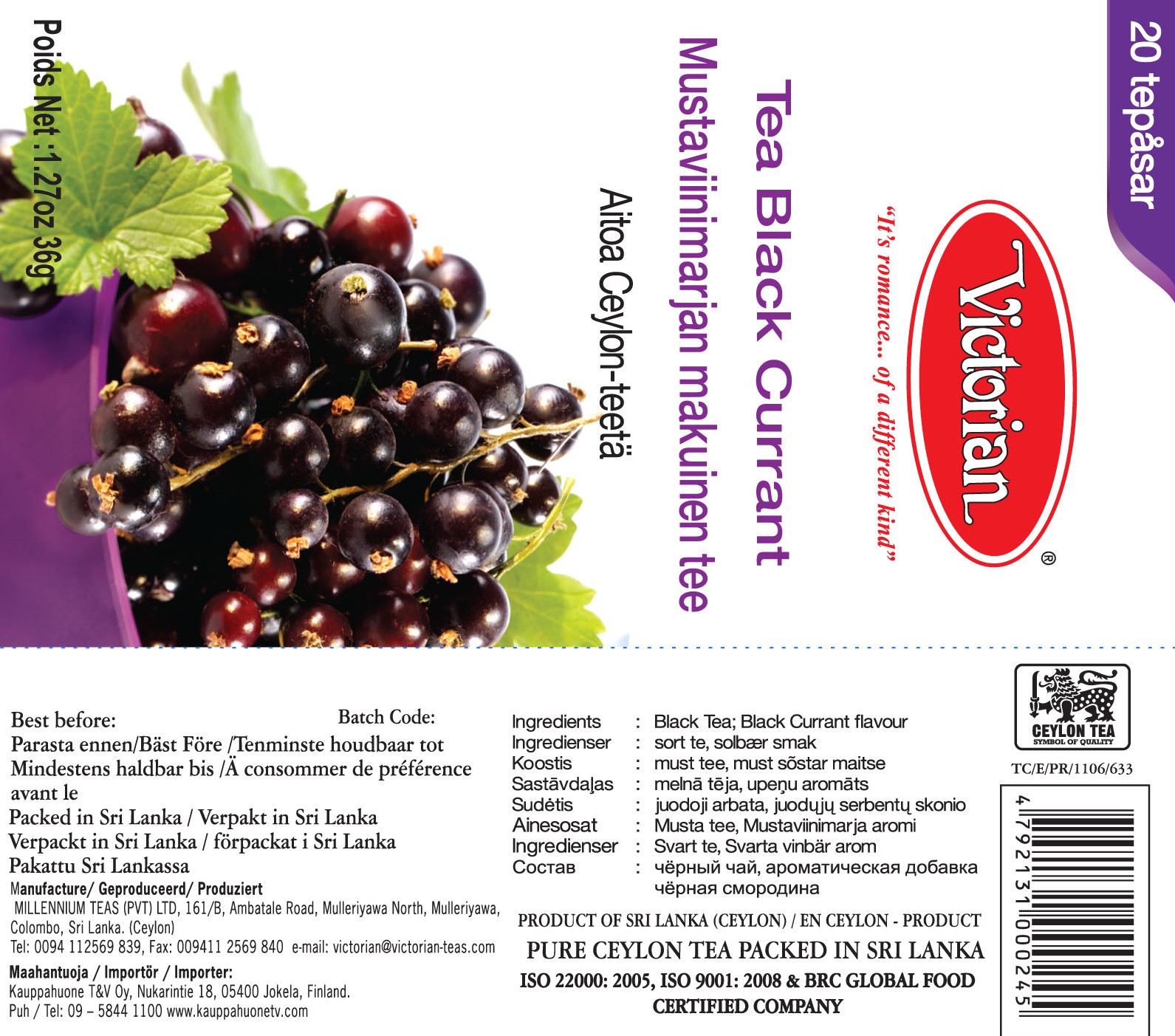Mustaherukka-aromilla maustettu Ceylon -musta tee.