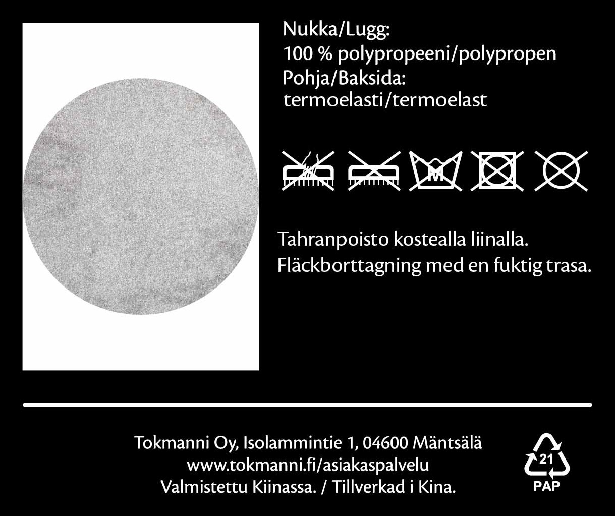 Pyöreä Kotikulta Siena -nukkamatto sopii monipuolisesti sisustamaan erilaisia tiloja. Yksivärinen matto on ajaton valinta ja helppo yhdistää osaksi muuta sisustusta. Matossa on liukuestepohja, joka pitää maton tukevasti paikallaan.
