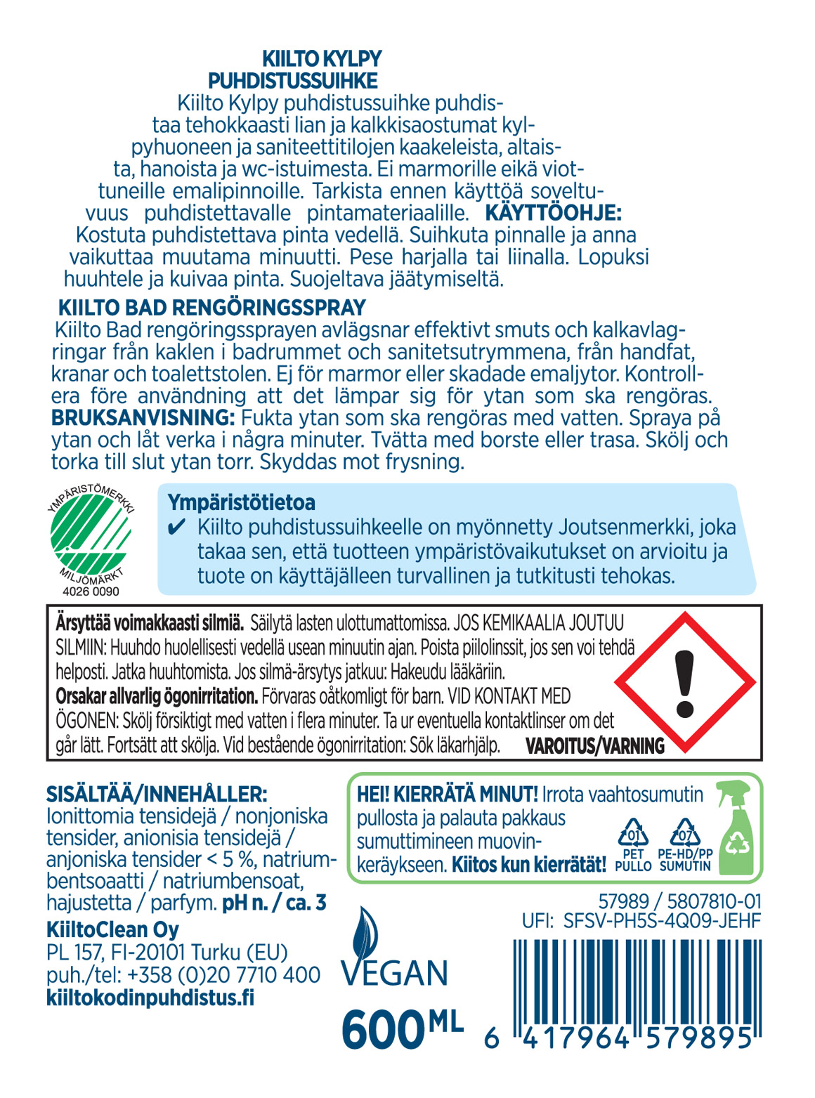 Kiilto Kylpy Biohajoava Puhdistussuihke puhdistaa tehokkaasti saniteettitilat. Suihke soveltuu lian ja kalkkisaostumien puhdistukseen kylpyhuoneen ja saniteettitilojen kaakeleista, altaista, hanoista ja wc-istuimesta. Puhdistussuihkeessa on miellyttävä, raikas tuoksu.