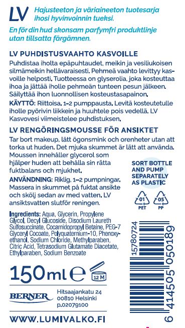 Mieto ja hellävarainen LV -puhdistusvaahto puhdistaa iholta meikin ja epäpuhtaudet. Vegaaninen ja hajusteeton tuote sisältää glyserolia, joka kosteuttaa ihoa ja säilyttää ihon luonnollisen kosteustasapainon.