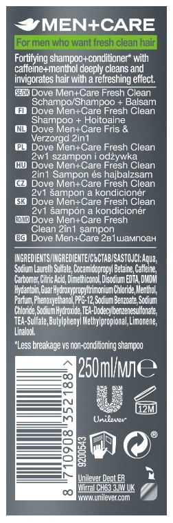 Vahvistava Dove Men Care Fresh Clean 2in1 shampoo + hoitoaine elvyttää hiukset puhdistaen ne syvältä. Virkistävää mentholia ja kofeiinia sisältävä 2in1 shampoo jättää raikkaan ja virkistyneen tunteen. Samalla tuotteen koostumus tekee hiuksista helposti kammattavat ja pehmeät. Pakkauskoko 250 ml.