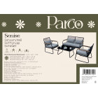 Parco Senise -sohvaryhmässä on sohva, 2 tuolia, lasikantinen pöytä sekä istuin- ja selkänojatyynyt. Kalusteissa on mustaksi maalattu teräsrunko. Istuinosat ja selkänojat ovat polyrottinkia, käsinojat polywoodia. Pöytälevy on karkaistua lasia. Tyynyissä on UV-suojatut ja pestävät päälliset (100 % polyesteria, käsinpesu 30 °C).