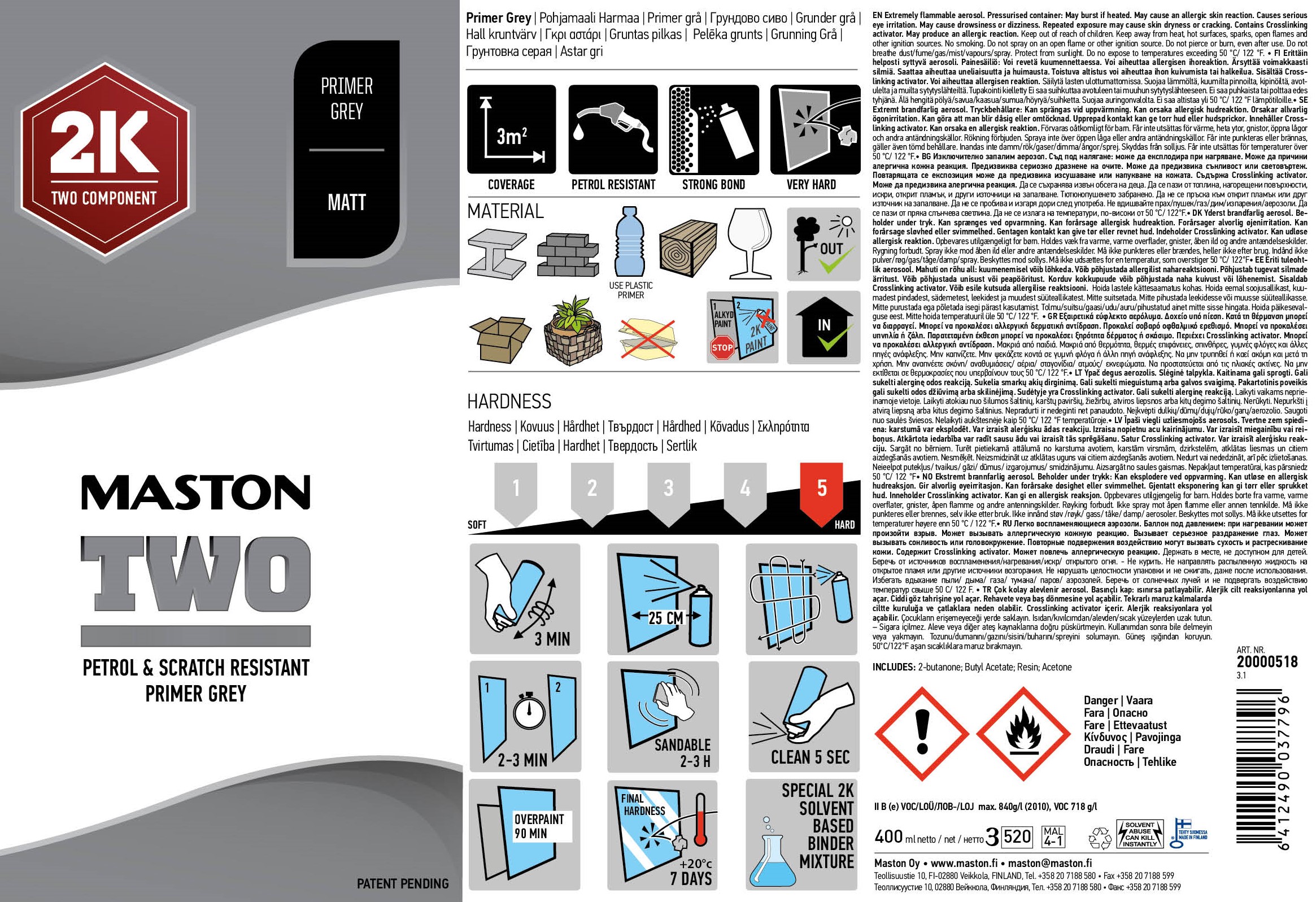 Maston 2K Two- 2-komponentti spraymaali tekee maalaamisesta helppoa. Käyttövalmiissa maalissa on maali ja kovettaja valmiiksi sekoitettuna ja maali kuivuu nopeasti heti suihkutettaessa. 2K Two-spraymaalilla maalaat lähes mitä tahansa pintoja: metallia, alumiinia, kuparia, kromia, puuta, kiveä, lasia, keramiikkaa jne.
