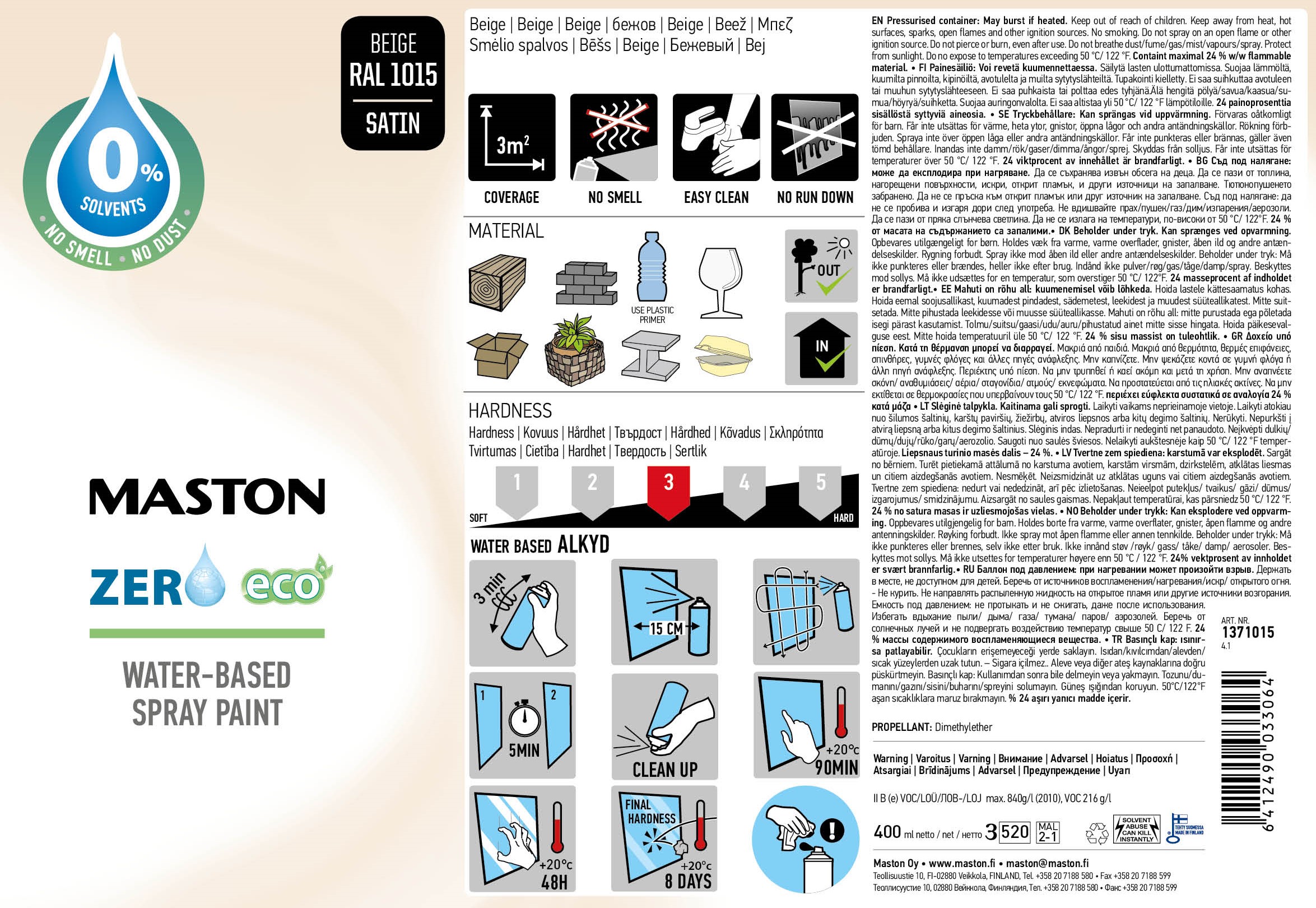 Maston Zero on turvallinen ja helppokäyttöinen vesiohenteinen spraymaali. Maalaaminen Zerolla on vaivatonta: kaksi peräkkäin maalattavaa kerrosta riittää luomaan 25-30 mikronin paksuisen kalvon. Maali on aina uudelleen maalattavissa, uusi kerros märälle pinnalle tai uusi kerros kuivalle pinnalle. Maali ei sisällä liuottimia ja siksi sen tuoksu on hyvin heikko ja miellyttävä.