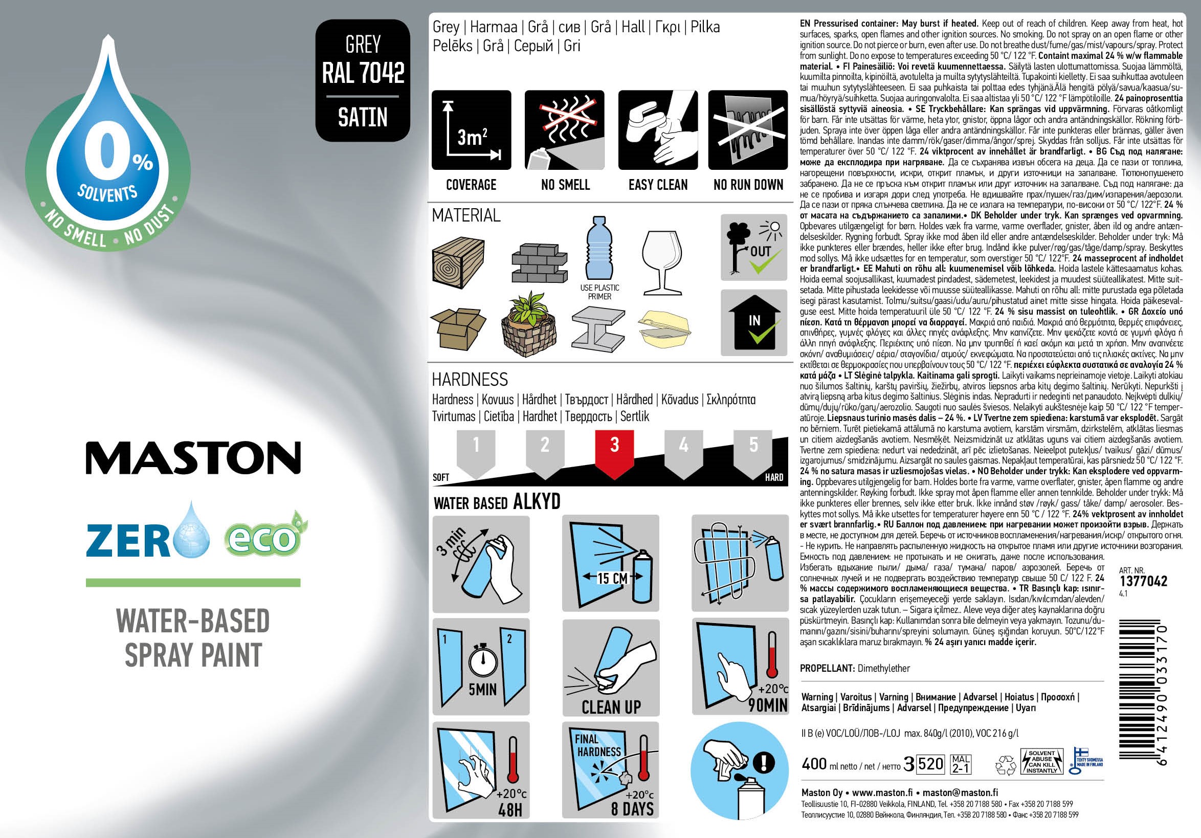 Maston Zero on turvallinen ja helppokäyttöinen vesiohenteinen spraymaali. Maalaaminen Zerolla on vaivatonta: kaksi peräkkäin maalattavaa kerrosta riittää luomaan 25-30 mikronin paksuisen kalvon. Maali on aina uudelleen maalattavissa, uusi kerros märälle pinnalle tai uusi kerros kuivalle pinnalle. Maali ei sisällä liuottimia ja siksi sen tuoksu on hyvin heikko ja miellyttävä.
