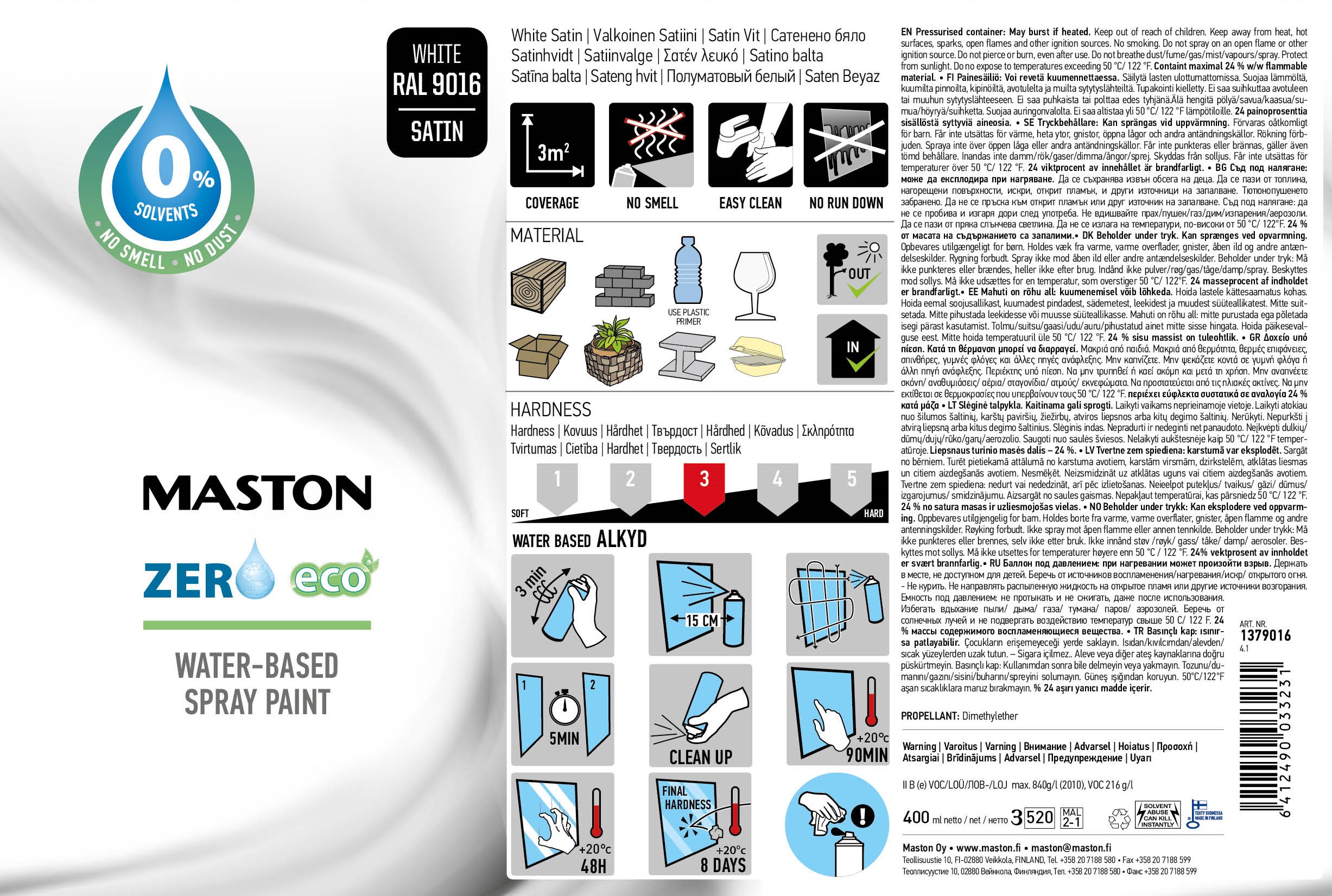 Maston Zero on turvallinen ja helppokäyttöinen vesiohenteinen spraymaali. Maalaaminen Zerolla on vaivatonta: kaksi peräkkäin maalattavaa kerrosta riittää luomaan 25-30 mikronin paksuisen kalvon. Maali on aina uudelleen maalattavissa, uusi kerros märälle pinnalle tai uusi kerros kuivalle pinnalle. Maali ei sisällä liuottimia ja siksi sen tuoksu on hyvin heikko ja miellyttävä.