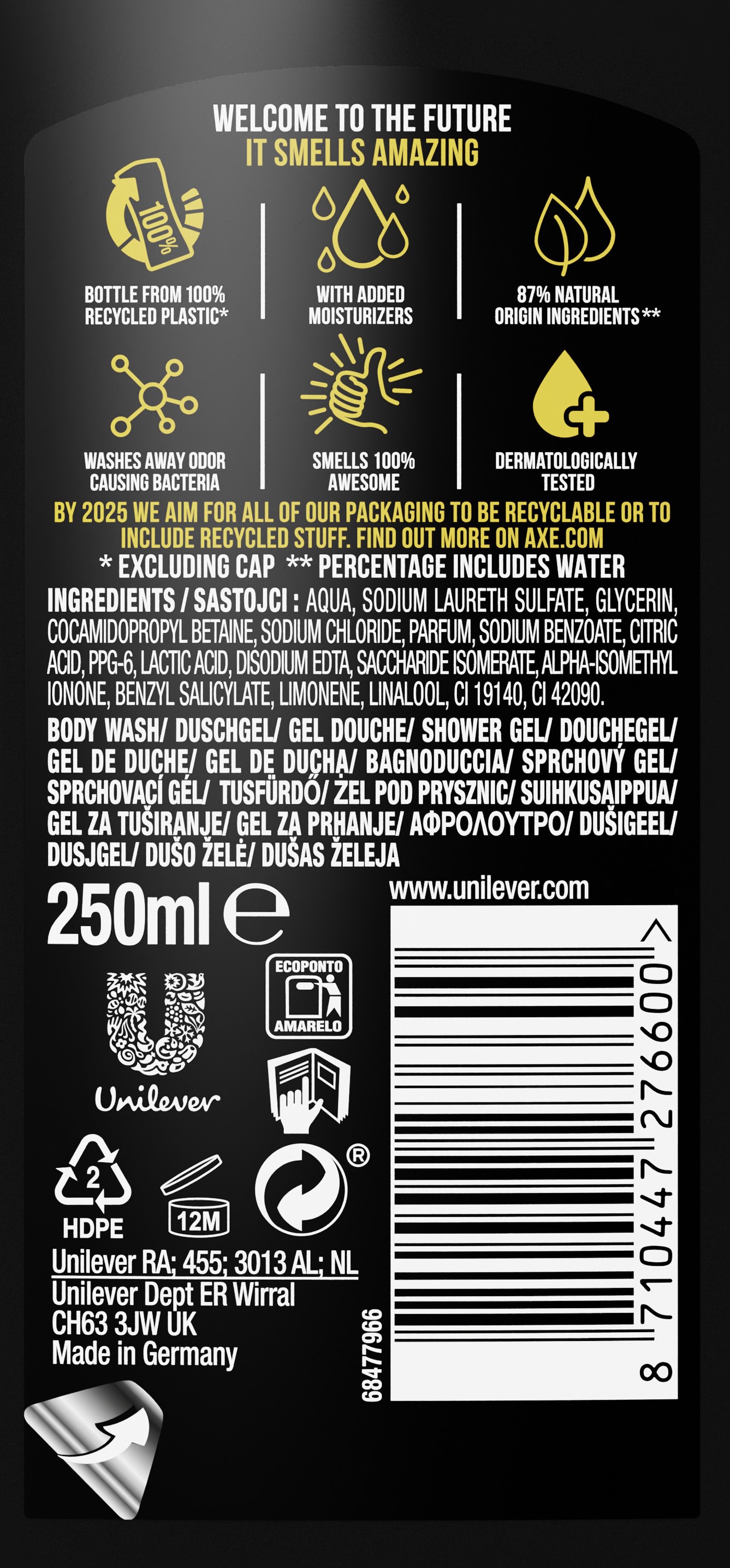 Axe Black 3in1 -suihkugeeliä puhdistaa tehokkaasti kasvot, vartalon ja hiukset. Sen raikas tuoksu juurtaa juurensa päärynän ja seetripuun yhdistelmään, joka tuoksuu iholla pitkään vielä suihkun jälkeenkin.