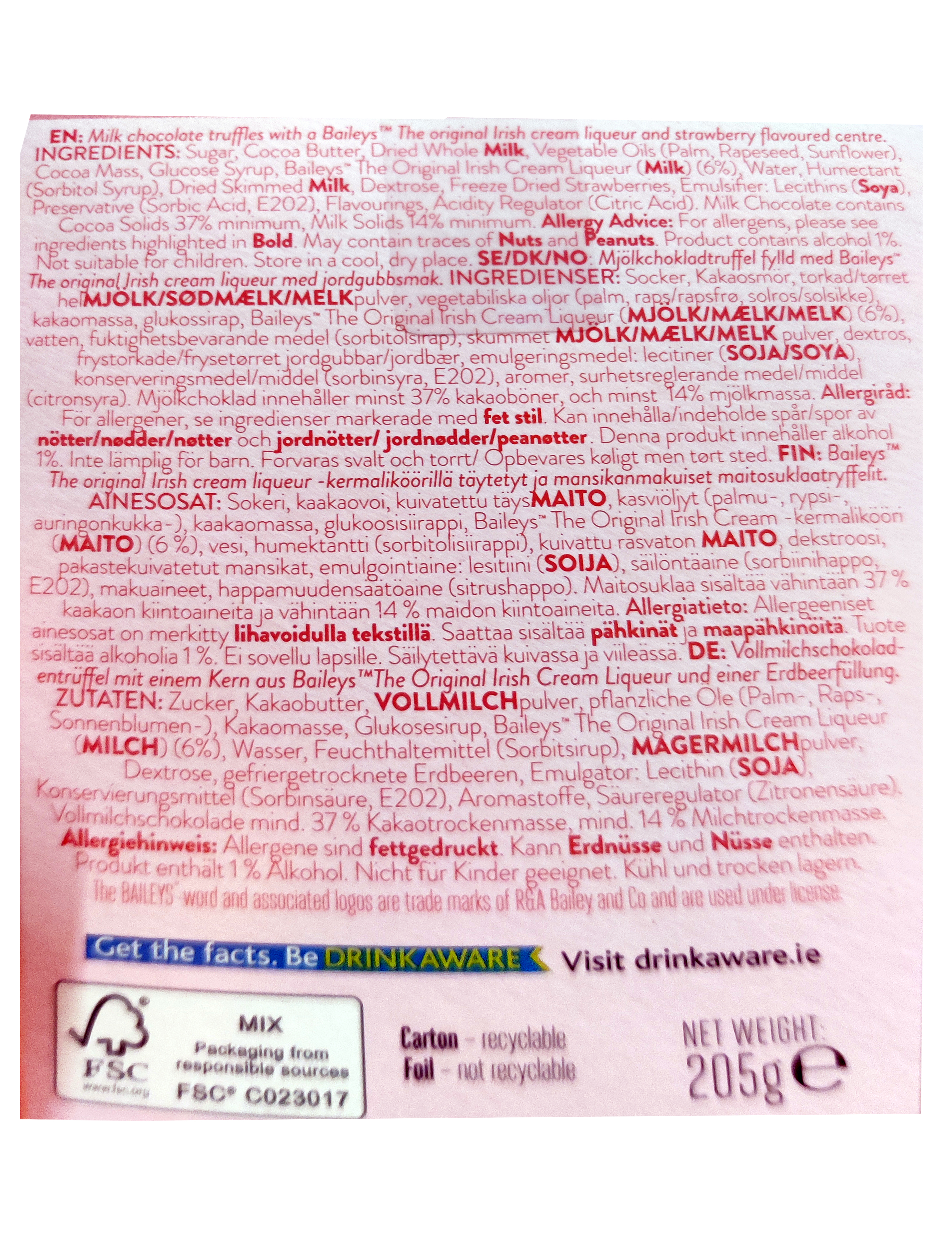 Herkullisia maitosuklaatryffeleitä Baileys-kermaliköörillä ja mansikan makuisella täytteellä. Kaunis rasia on erinomainen vieminen tai lahja läheiselle.