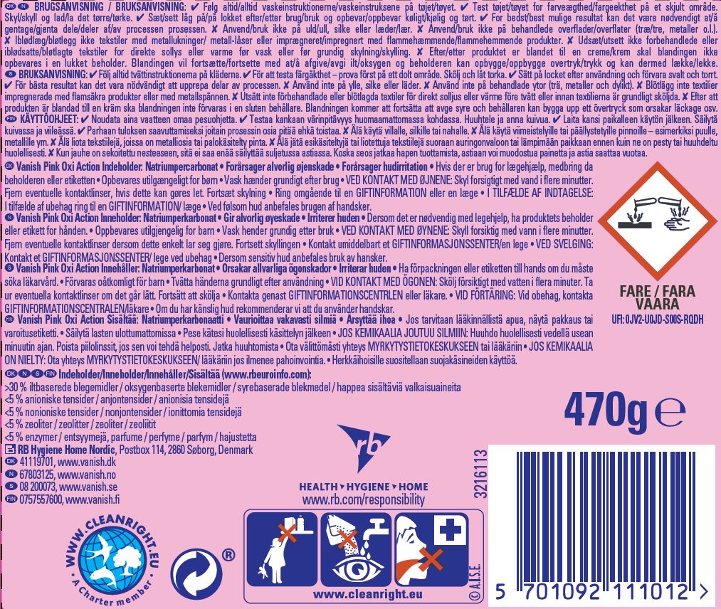 Hämmästyttävää tahranpoistotehoa jo heti ensimmäisellä käyttökerralla! Vanish Pink Gold Oxi Action tahranpoistojauheella saat uskomattomat tahranpoistotulokset helposti ja nopeasti. Voit käyttää tahranpoistojauhetta turvallisesti sekä kirjo- että valkopyykille. Jauheen koostumuksen sisältämä Oxi Powerlift poistaa kaikenlaiset tahrat – myös vaikeat tahrat jopa 30 sekunnissa. Käsittele tahra tuoreeltaan tahranpoistojauheella ja pese se sen jälkeen normaalisti pyykkikoneessa. Voit myös lisätä jauhetta suoraan pyykinpesuainelokeroon pesuaineen sekaan.