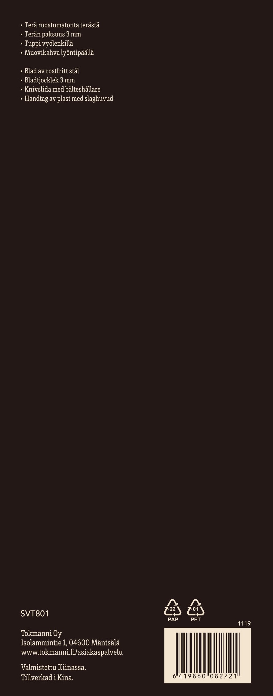 Kovaakin käyttöä kestävän talttapuukon terä on valmistettu ruostumattomasta teräksestä. Puukossa on muovikahva lyöntipäällä ja tuppi vyölenkillä. Terän paksuus on 3 mm.
