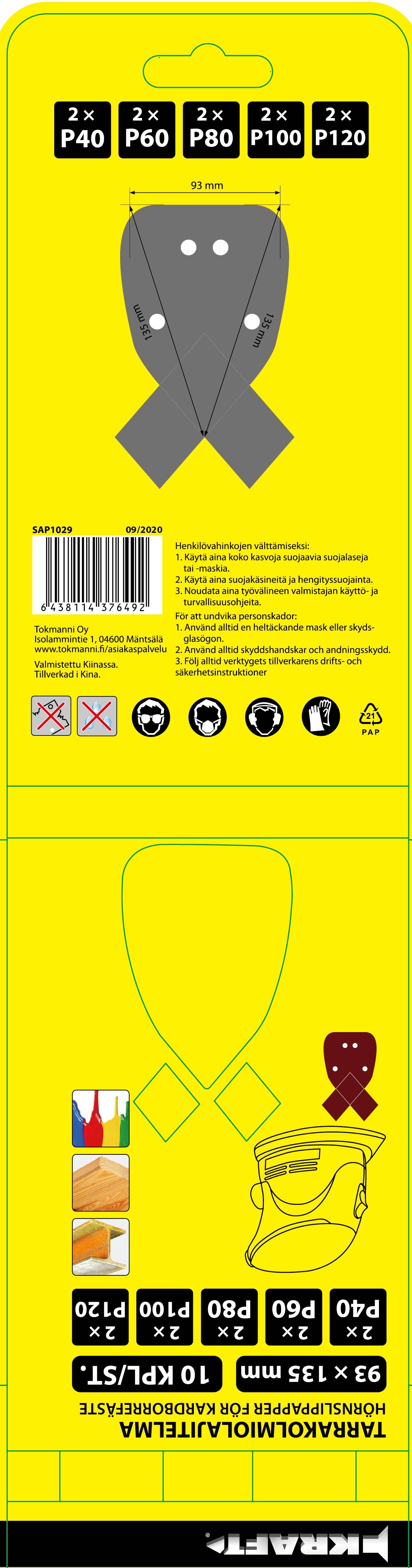 Kraft Tarrakolmiolajitelma sisältää 10 kpl 5 eri karkeutta olevaa tarrakolmiota: 2 x P40, 2 x P60, 2 x P80, 2 x P100 sekä 2 x P120. Tarrakolmion koko on 93 x 135 mm.