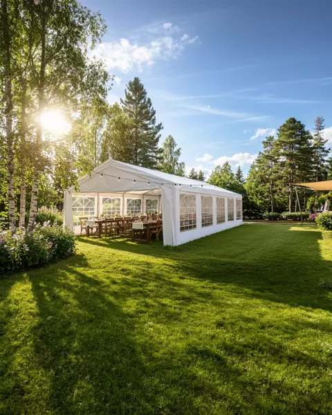 Suomen kesä on yllätyksiä täynnä, joten selkeä katettu kohta tekee juhlista stressittömämmät: varjoa helteellä ja suojaa sateella. Juhlateltta myös rajaa juhlatilan ja helpottaa kalustamista. Jos käytössä on terassi tai terassimainen alue, se toimii erinomaisena juhlan keskuksena – tasainen alusta helpottaa ruokailua, kalustamista ja koristelua.