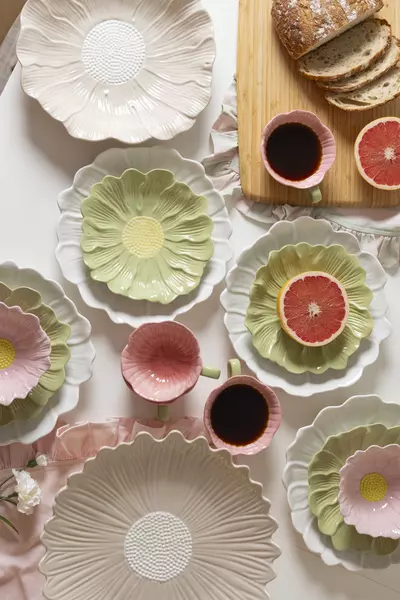 Herkät, kukkien muotoon suunnitellut lautaset, mukit ja tarjoiluastiat. Sävyissä hehkuvat pinkki, keltainen, beige, valkoinen ja hennon vihreä. Jokainen astia on kuin pieni kukka — täydellinen kevään kattauksiin.