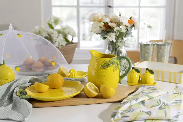 Piristä keittiötäsi hehkuvan keltaisilla sitruunoilla! Sarjaan kuuluu mm. kaadin, muki, lautanen ja pillimuki.