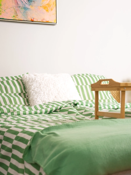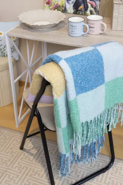 Pehmeät, pastelliset torkkupeitot — vaaleanpunasävyinen Ruudukas ja keväisen pirteä Check — tuovat sisustukseen lämpöä ja kerroksellisuutta.