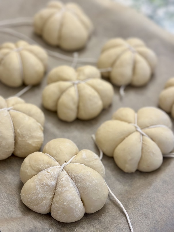 - Kaada taikina jauhotetulle pöydälle ja vaivaa ilmakuplat pois. Muotoile taikinasta tanko ja jaa se haluamasi kokoisiin osiin (esim. 24 kpl). Pyörittele palat pyöreiksi pulliksi ja anna kohota liinan alla noin 30 minuuttia.