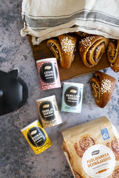 - Sekoita osaan jauhoista kuivahiiva ja lisää se taikinanesteeseen. Lisää loput jauhot ja voisula tai öljy. Alusta taikina tasaiseksi ja kimmoisaksi. Anna kohota liinan alla lämpimässä paikassa noin 40 minuuttia.