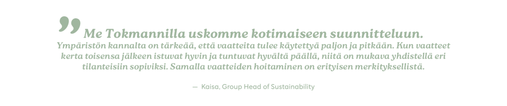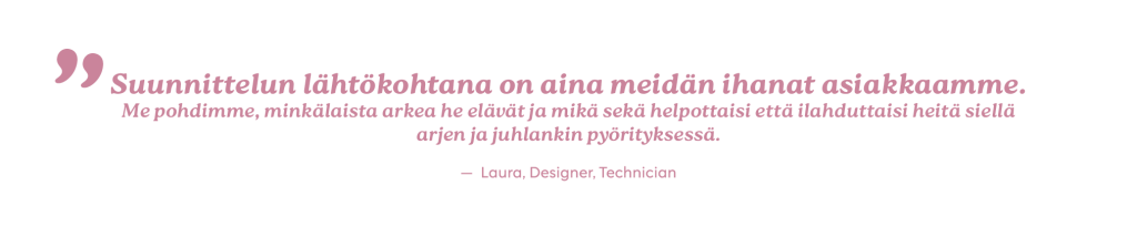 Suunnittelutyötä tehdään huolella – aina materiaaleista, väreistä ja leikkauksista mitoitukseen ja sovituksiin saakka. Esimerkiksi mitoituksessa huomioidaan eurooppalainen standardi sekä suomalaisten vartaloiden tarpeet. Materiaalit valitaan käyttötarkoituksen mukaan, ja ne testataan huolellisesti, jotta vaatteet ovat mukavia, kestäviä ja helppohoitoisia.
