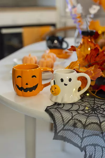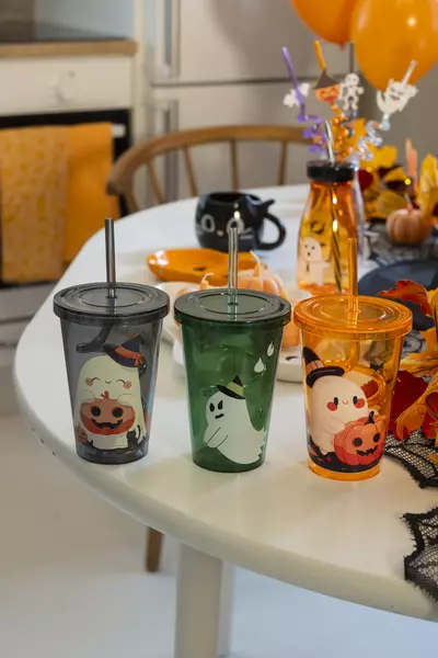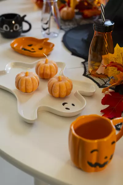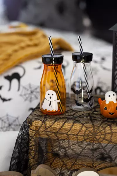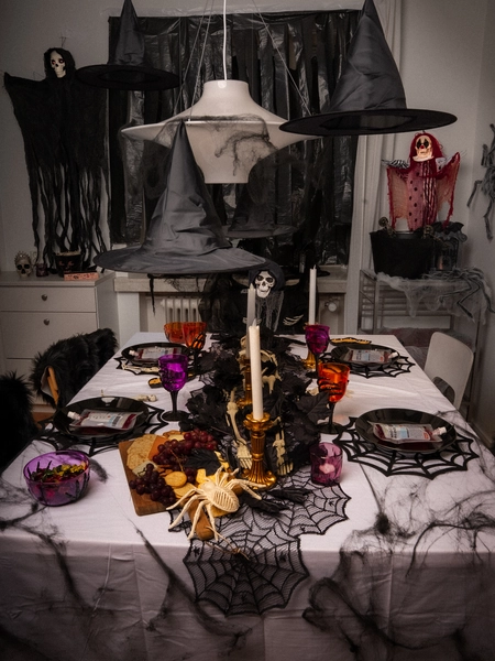 Kiinnittämällä huomiota juhlassa käytettyihin väreihin pääsee jo pitkälle! Käytä koristeissa ja kodintekstiileissä halloweenin perinteisiä värejä, kuten mustaa, oranssia, violettia ja vihreää. Tarjoile ruoat esimerkiksi haamukulhoista tai -lautasilta ja juomat teemaan sopivista mukeista tai pulloista.