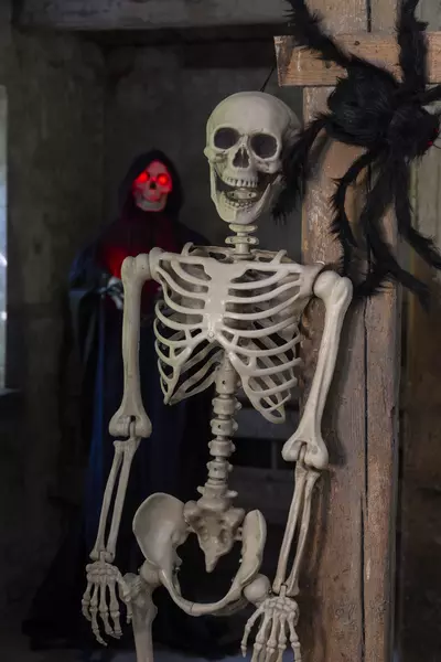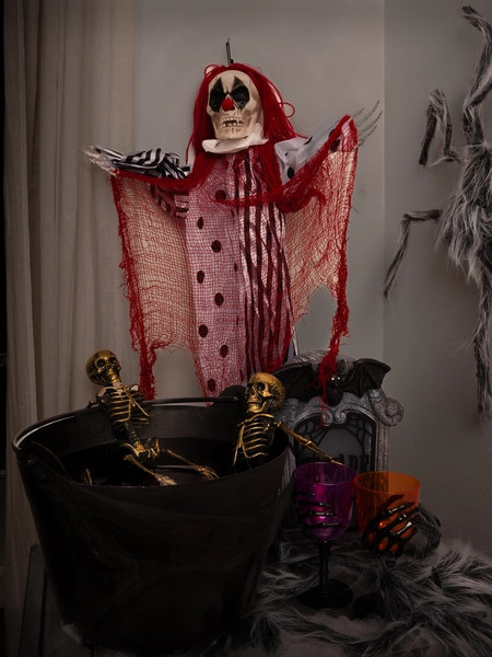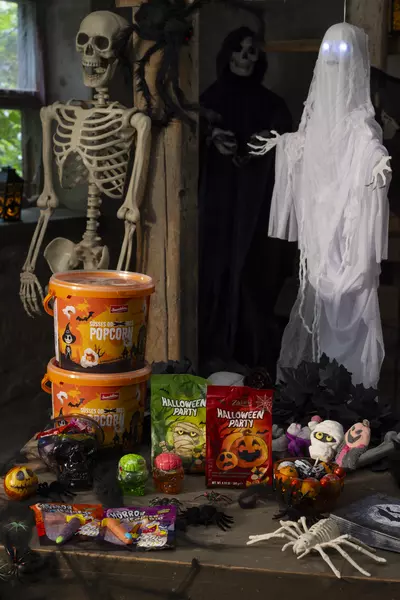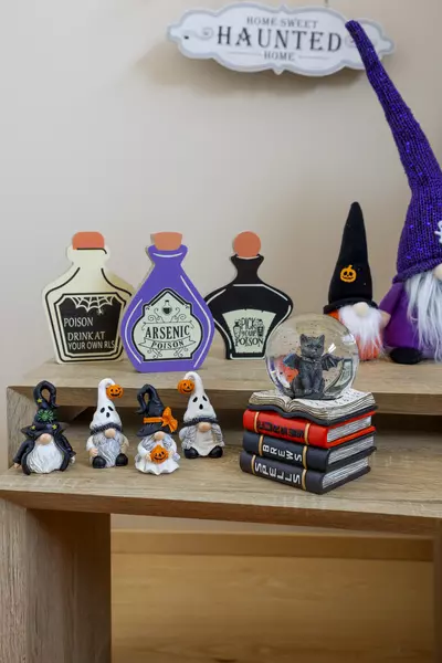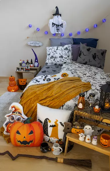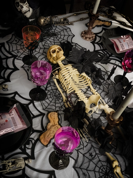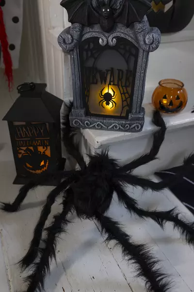 Asettele pitkin kotia hauskoja hahmoja yllättäviin paikkoihin. Tuikkaa koristehautakiviä kukkaruukkuihin ja laita reilusti hämähäkinverkkoa huonekasvien päälle ja ovenkarmeihin. Näitä koristeluideoita hyödyntämällä voit luoda yllättäviä yksityiskohtia, kuten vessan oven sisäpuolelle ripustettuja haamuja tai pimeässä hohtavia naamioita. Vaihda myös limsapullojen etiketit hurjiin tarroihin ja laita luuranko lentämään kattoon. Jos haluat vaihtaa myös verhot teemaan sopiviksi, kokeile ripustaa ikkunaan kurpitsa- tai hämähäkinverkkokuvioinen pöytäliina, musta lakana tai jätesäkkejä.