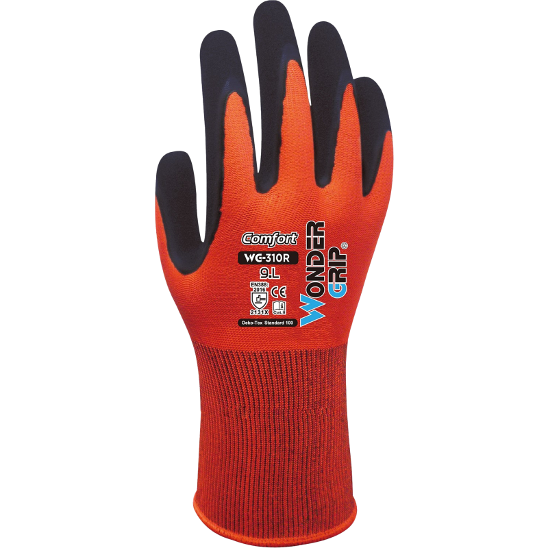 Miellyttävät ja hyvin suojaavat Wonder Grip Comfort WG-310 -työkäsineet. Kaksinkertainen lateksipäällyste. Joustava resori. Soveltuu hyvin myös märkiin olosuhteisiin. Väri punainen/musta. Koko 8 / M.